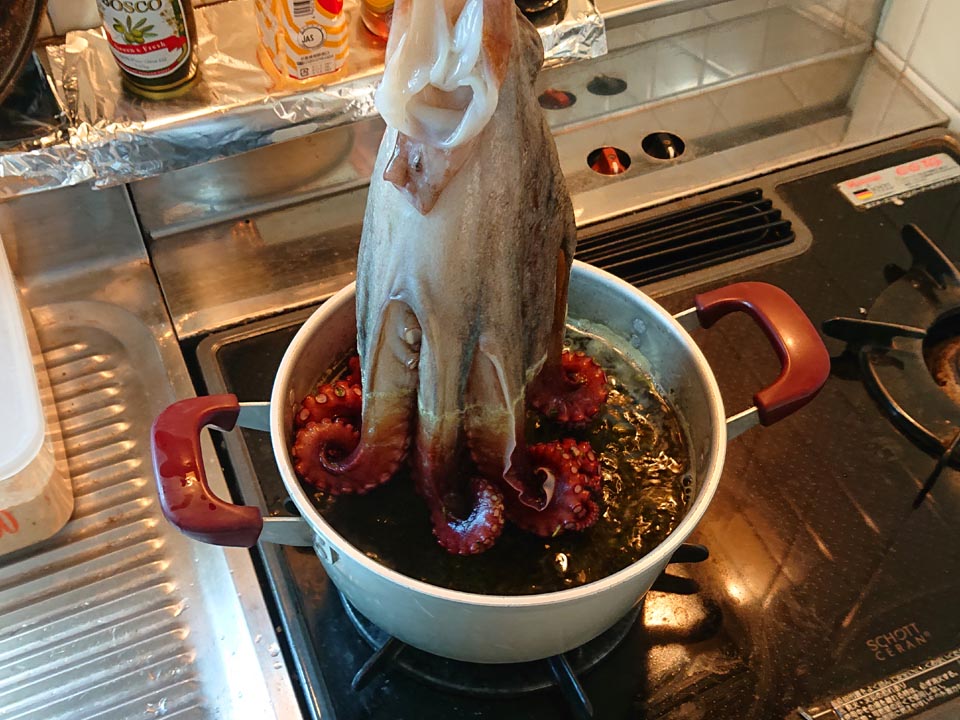 まずは飲み朋I東氏から頂いた江戸前真蛸を解凍し、塩で揉んでヌメリと汚れを落とし、内臓を抜いたら・・・・