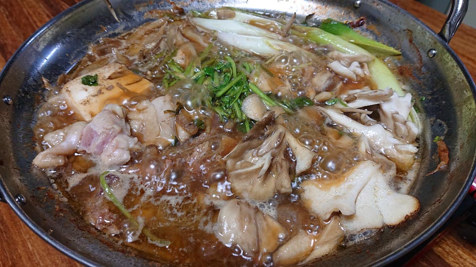 鶏かやきの食い方は、鶏は十二分に煮込みまして、滲出したダシと脂を纏ったささがき牛蒡やら芹と言ったざくを食うのです。
