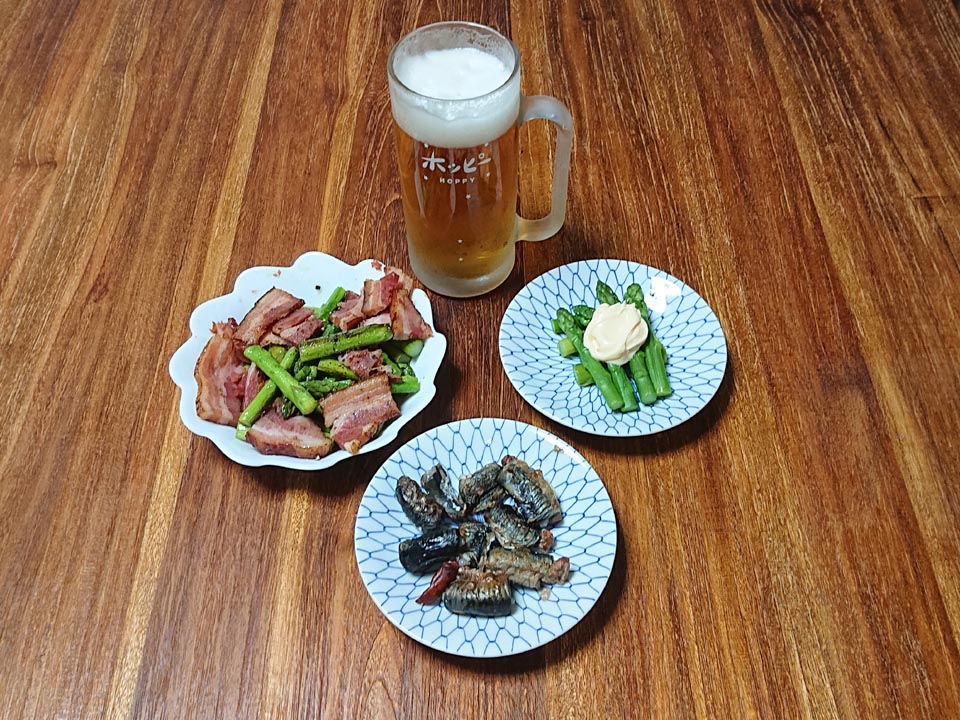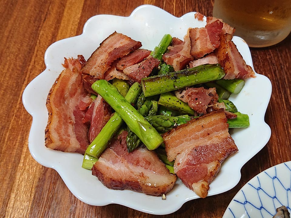 一緒に送らさって来たアスパラをね、カンクラのおじさんから頂いた高級ベーコンでもって炒めた。
