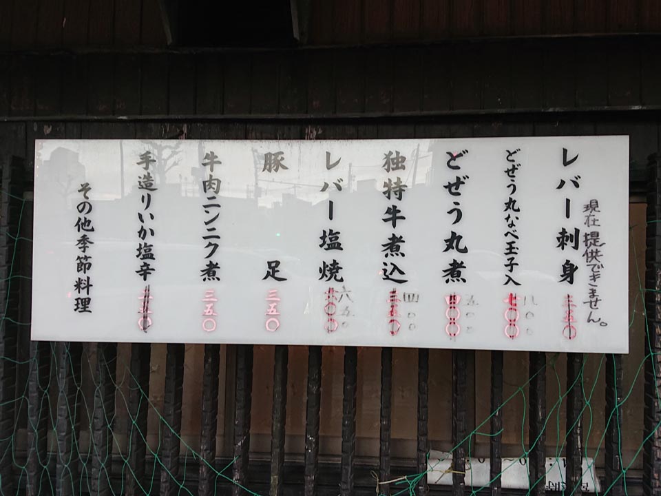 レバー刺身と独特牛煮込がここの売りだったらしいが、天下の悪法のお陰でレバ刺しはメニュー落ち。