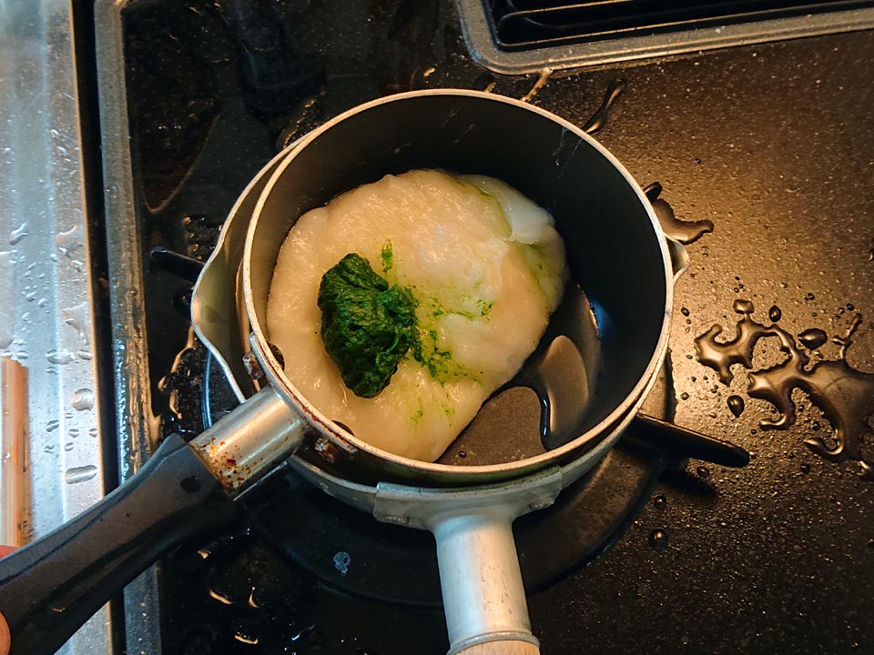 年末に仲間とついて凍らせてあったお餅をレンチンし、よもぎペーストを混ぜ込みます。