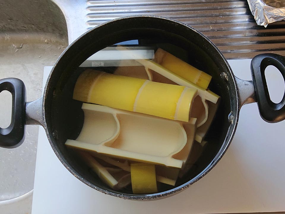 2時間茹でて一晩放置プレイで味見してみたら、僅かにエグ味が残ってるのと、やっぱし少々固めなので、穂先30センチ以下を再度1時間茹でて半日放置。