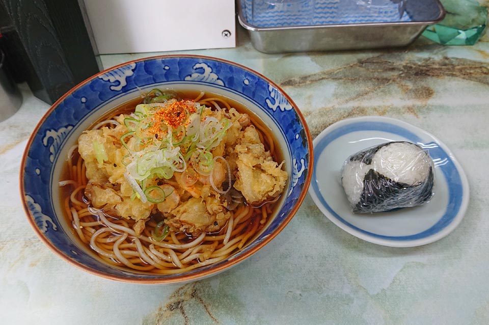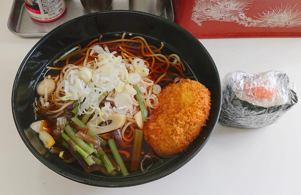 ここは天婦羅メニューの種類が少な目で、珍しく山菜蕎麦+コロッケ+明太子おにぎり。