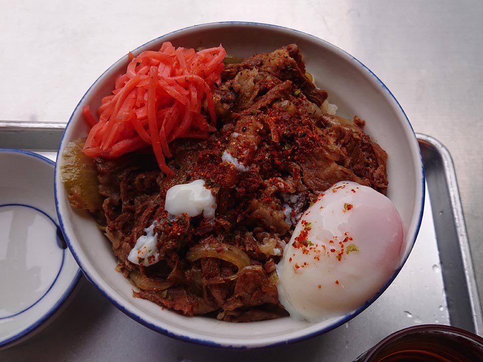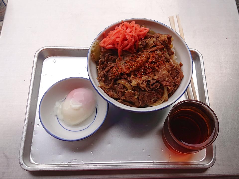鍋前特等席が開いてたけど、敢えて特設トロ箱席にて、牛丼大盛り・半熟卵。