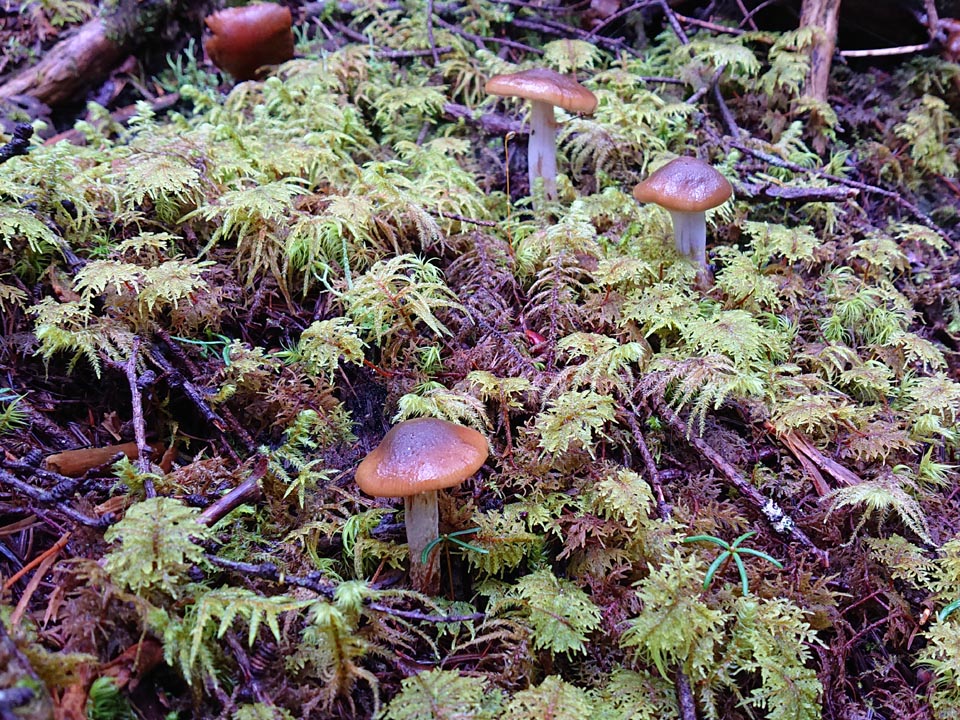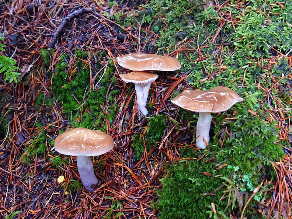 ③ 笠が茶色で軸が白く、軸上部にはフウセンタケ科の特徴である蜘蛛の巣状膜がある。