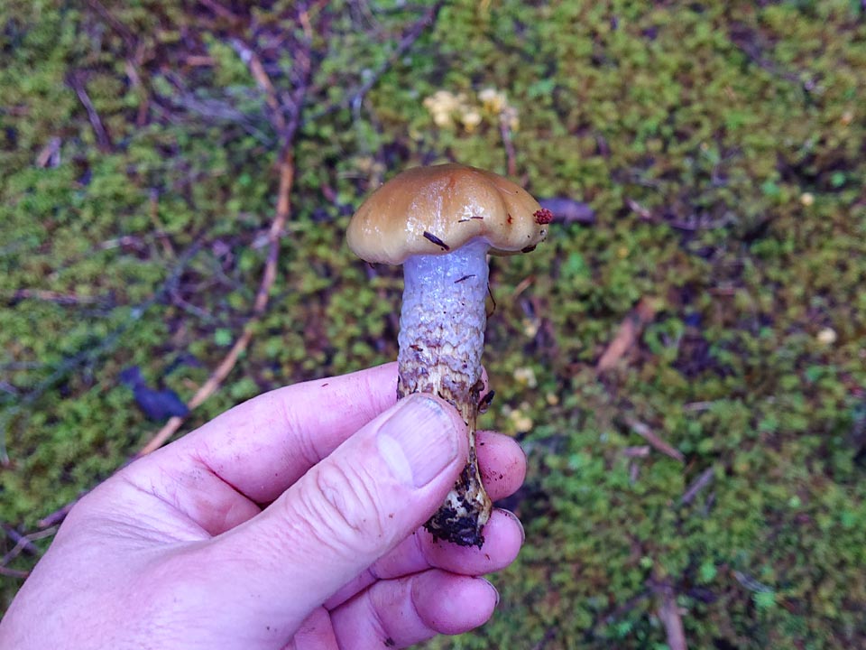 ⑤ 形態は②と同じだが、青味が全く無く、黄色味が強めで軸のひび割れ模様が茶色を帯びてるヤツはマムシフウセンタケで間違い無いところ。
