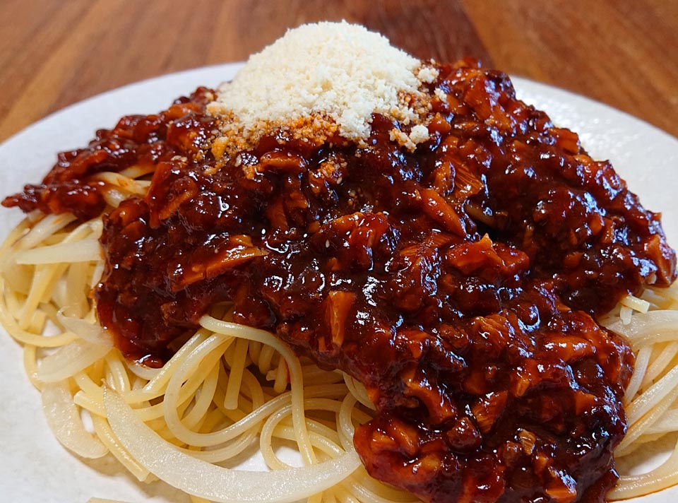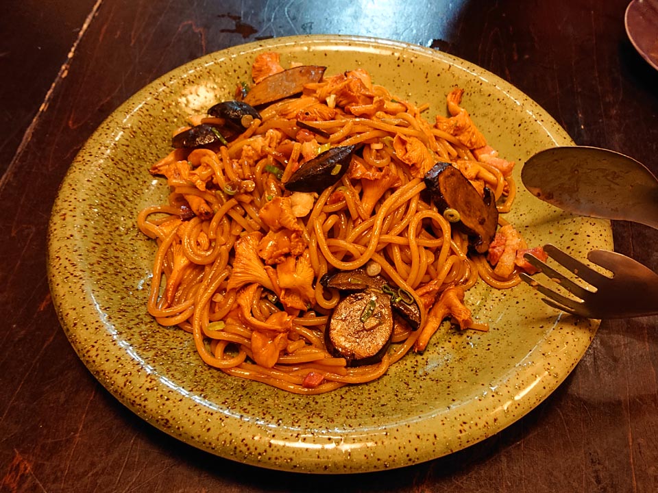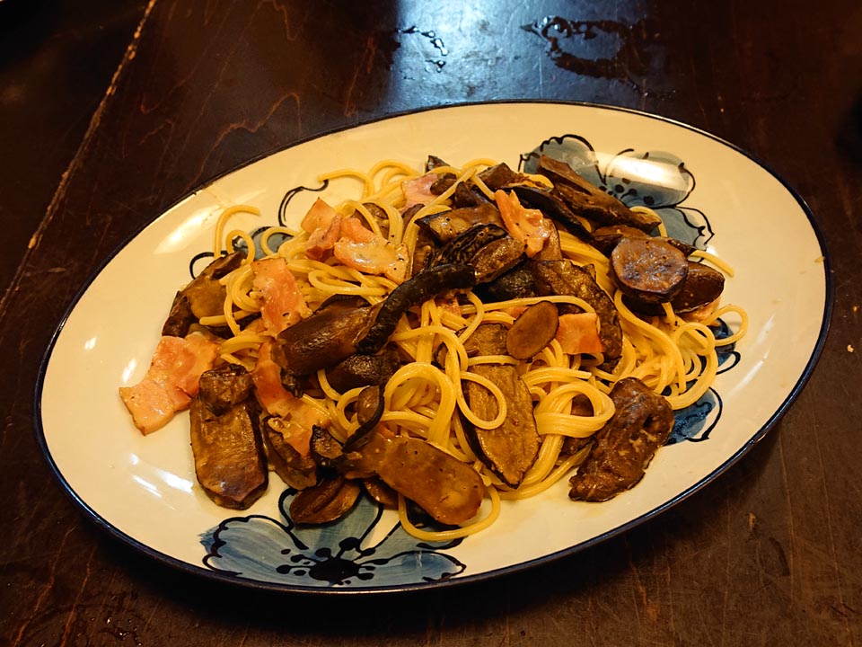 見掛けによらず主張の強いアンズタケ、濃ゆい味のミートソースとの相性はカナ~リいい。