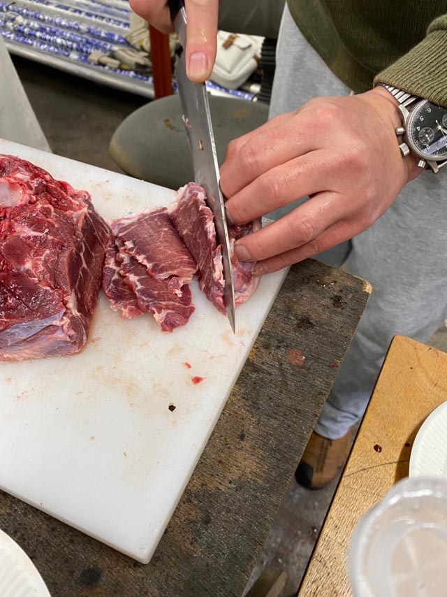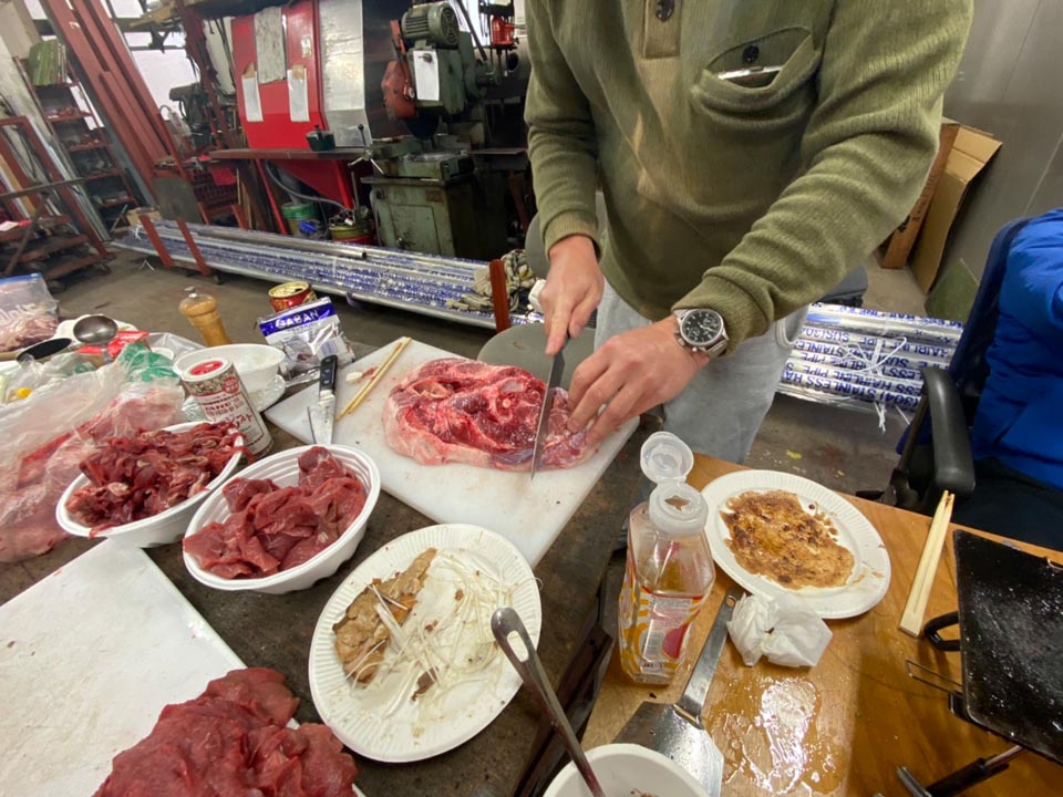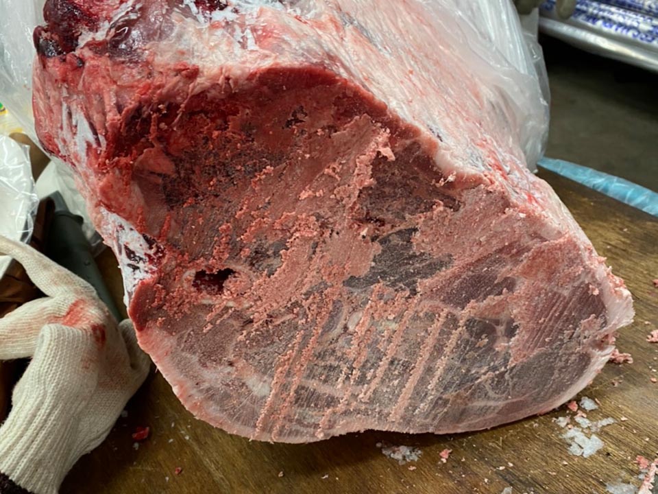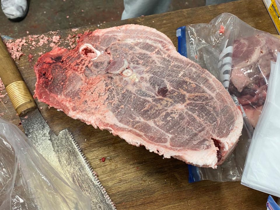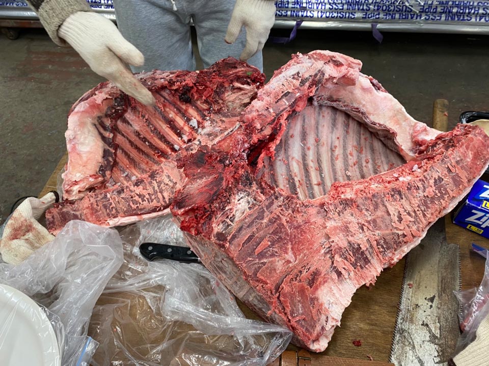 ところが解凍が間に合わず、鋸でロースを取ります。