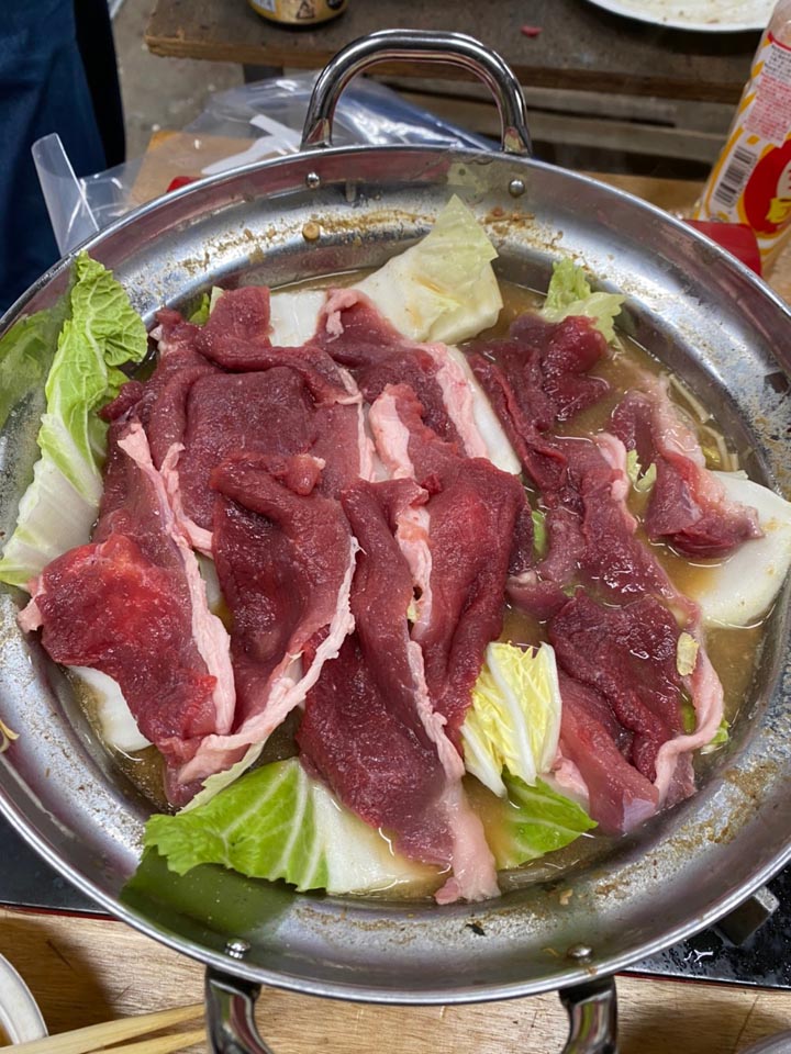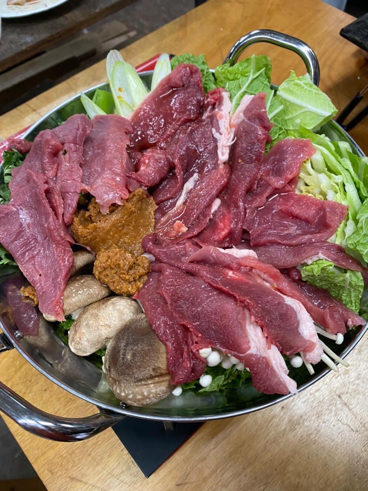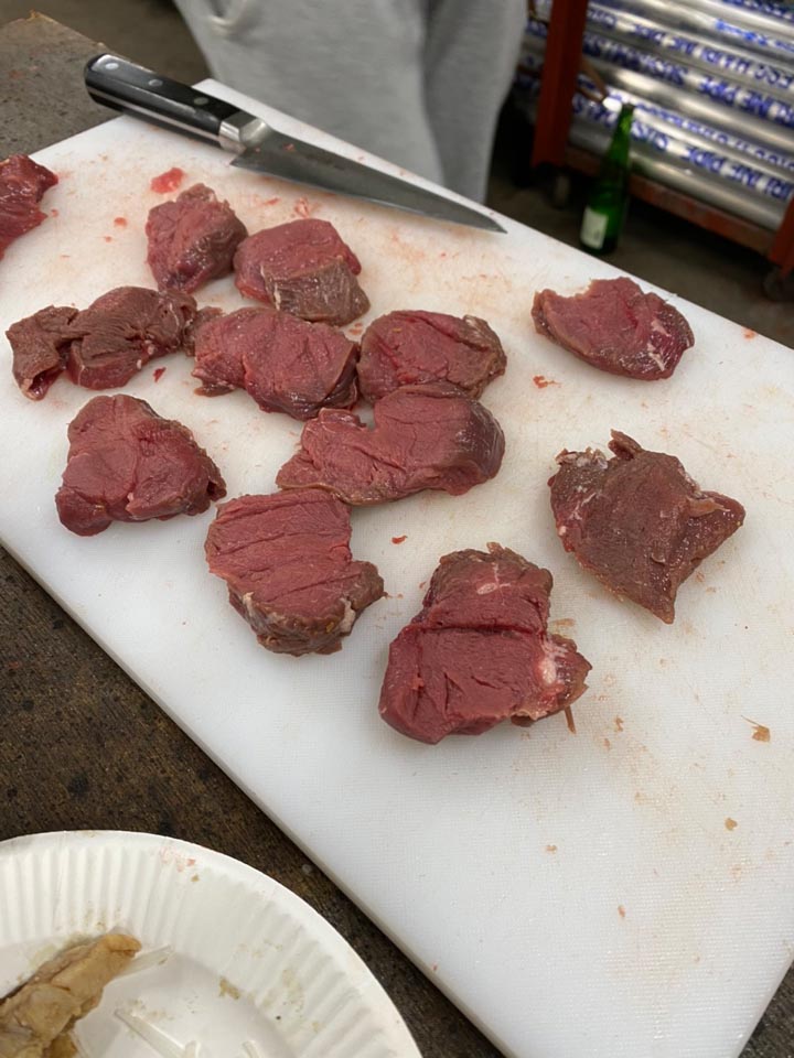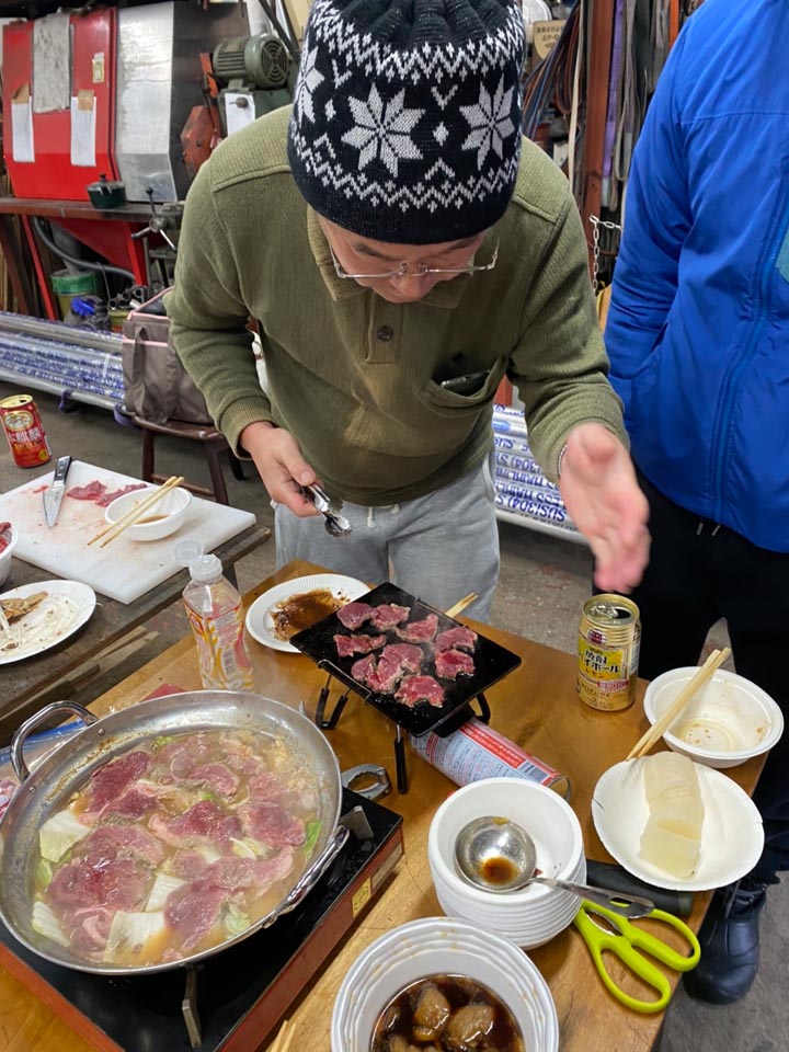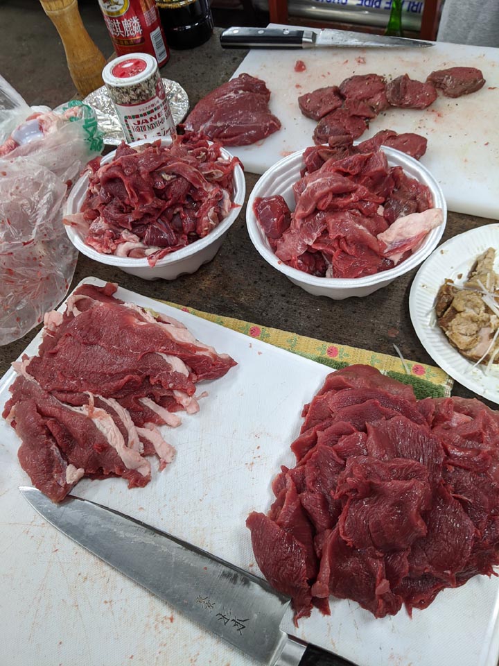 まずは早朝から骨を外してお肉にした腿の、芯玉やら内腿で猪鍋をセッティング。