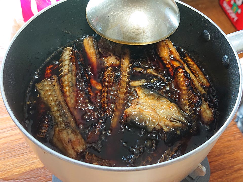 焼いた中骨と頭を醤油・酒・味醂・ザラメ砂糖で煮てタレをば。