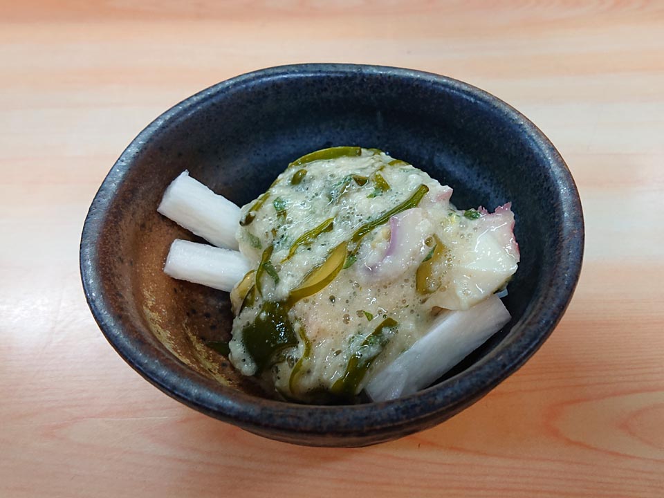 お通しの長芋とめかぶの小鉢うまし。