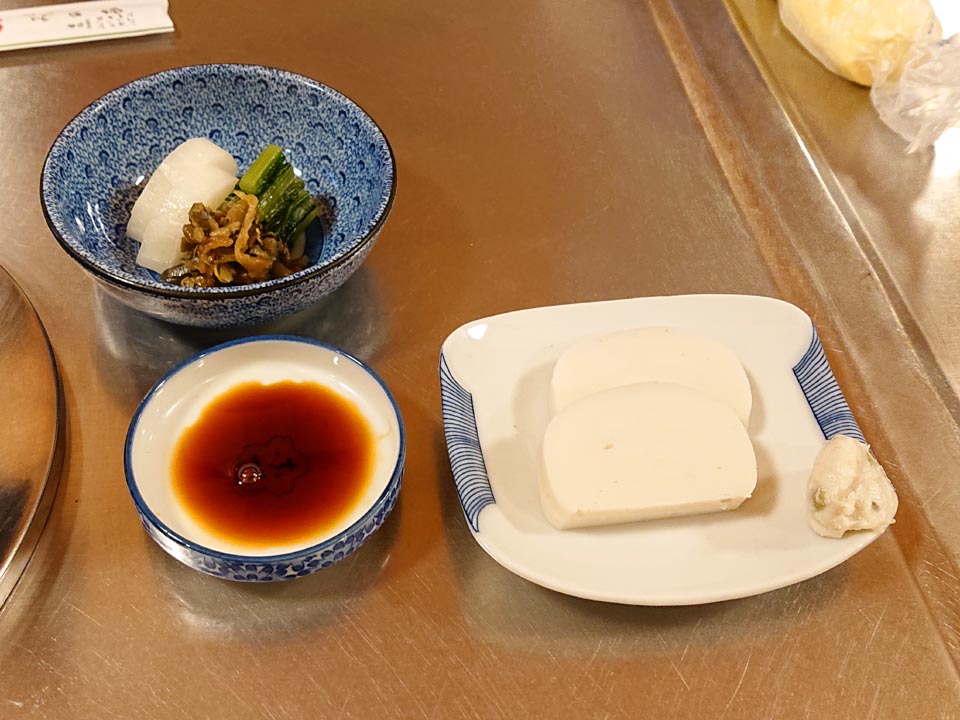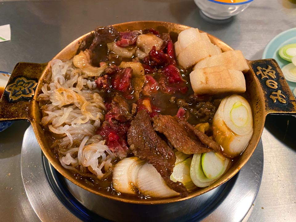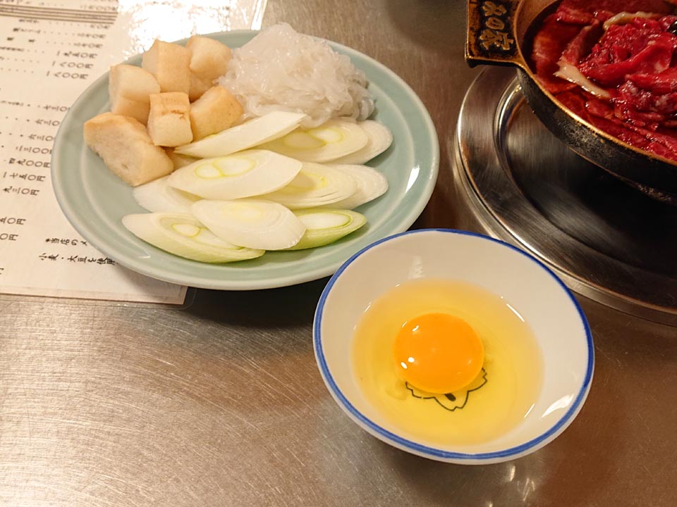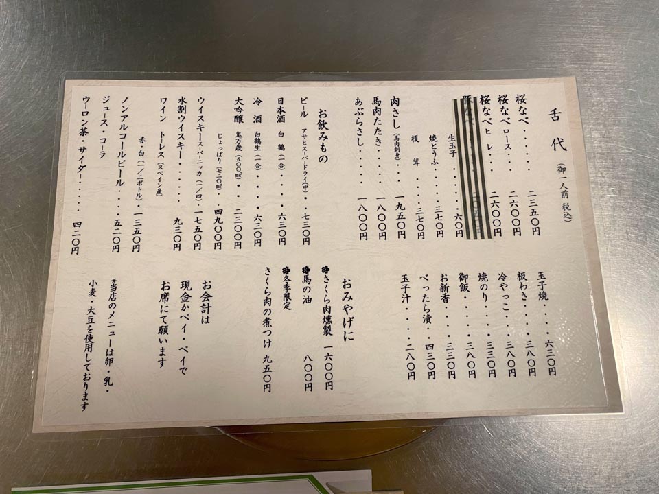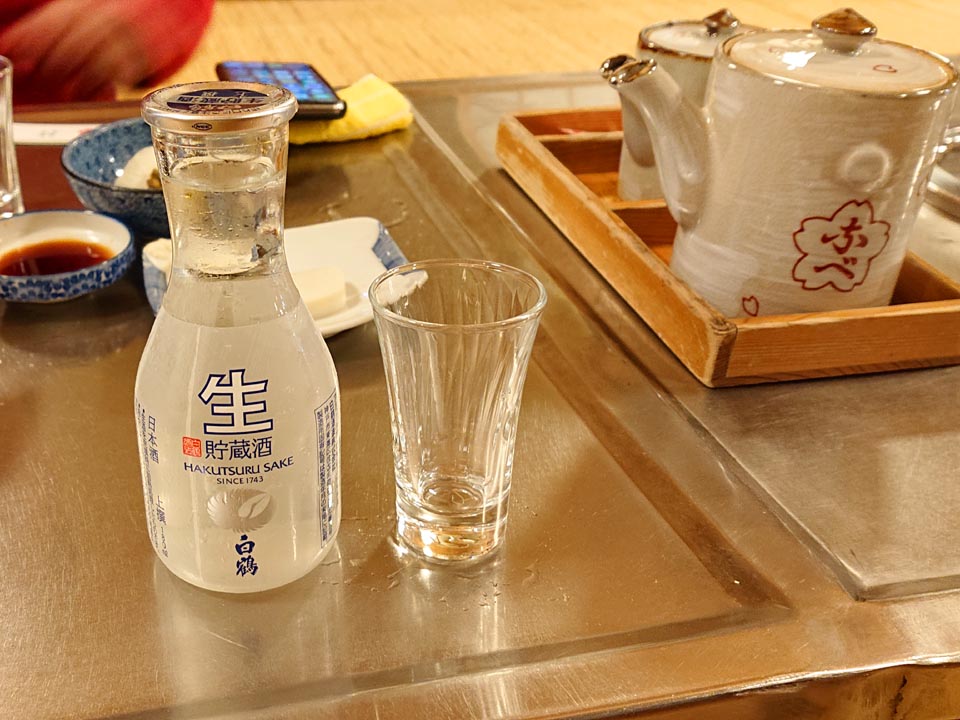 とりあえず瓶ビール・桜なべ二人前・玉子・お新香・玉子焼き・板わさをオーダーね。
