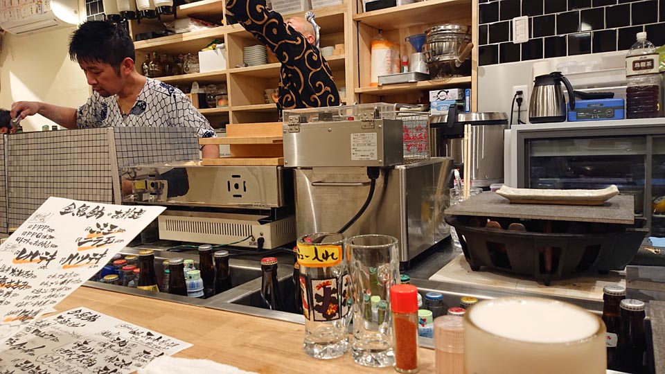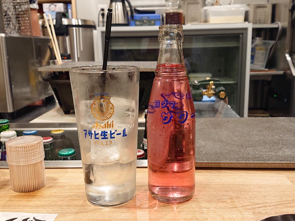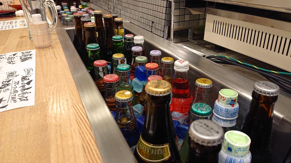 カウンターと調理場の境目に運河がありまして、ごちゃごちゃとドリンクが水冷されてる風景。
