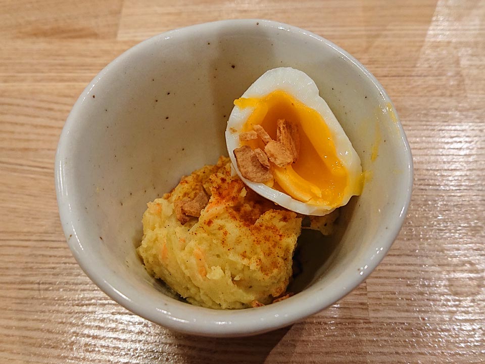 カレー風味のポテサラにカリッと揚げたニンニクとゆで卵がトッピングされてます。