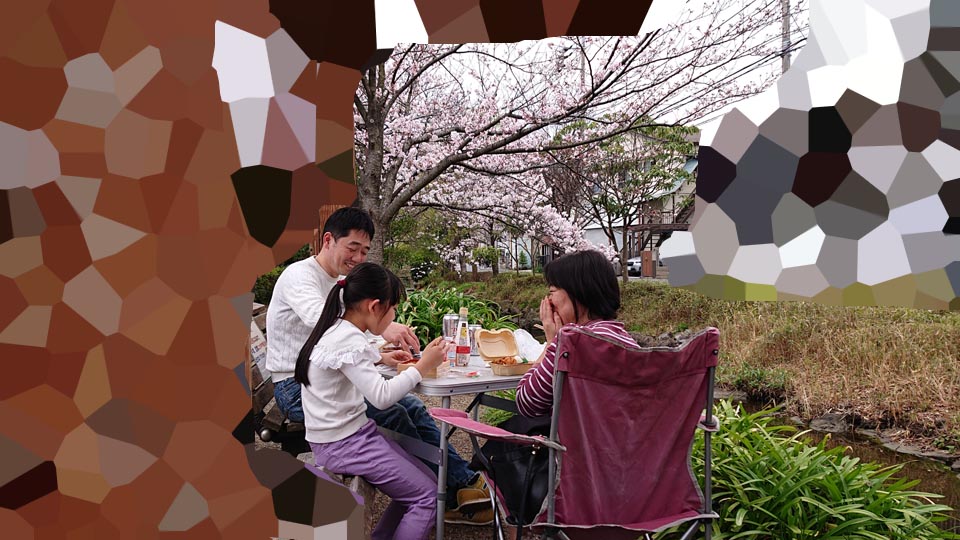 巷では自粛ムードびんびんで今年も花見を見かけないが、我慢出来ずにプチお花見してる親子を発見でパチリ。