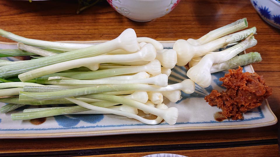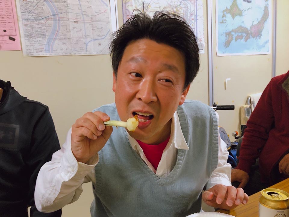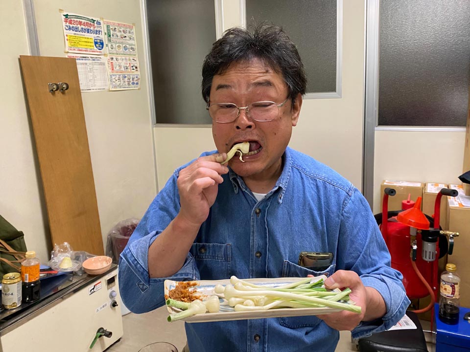 超ジャンボノビルを齧るマヌケ面のオッサン(ワハハー)