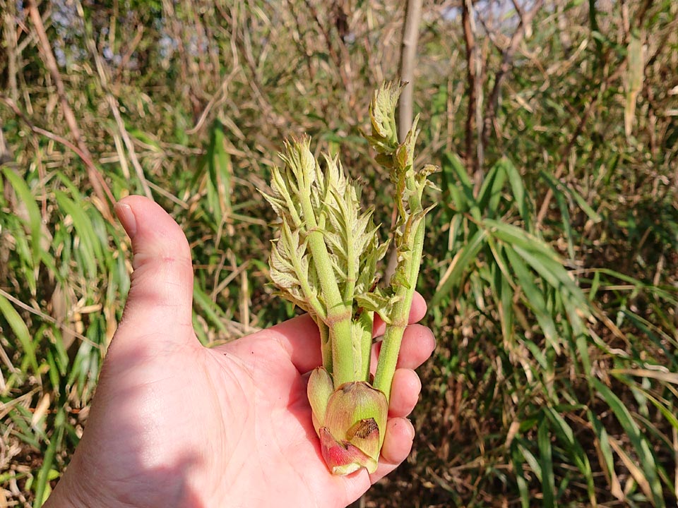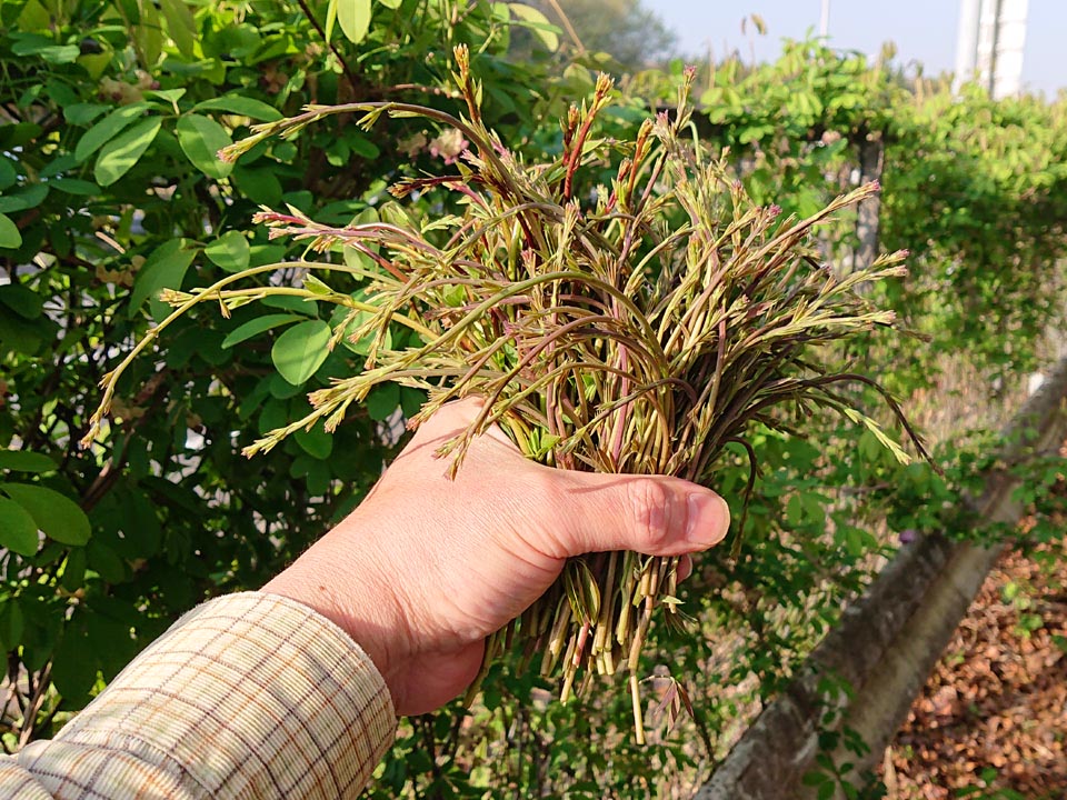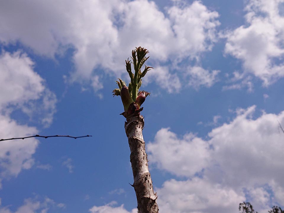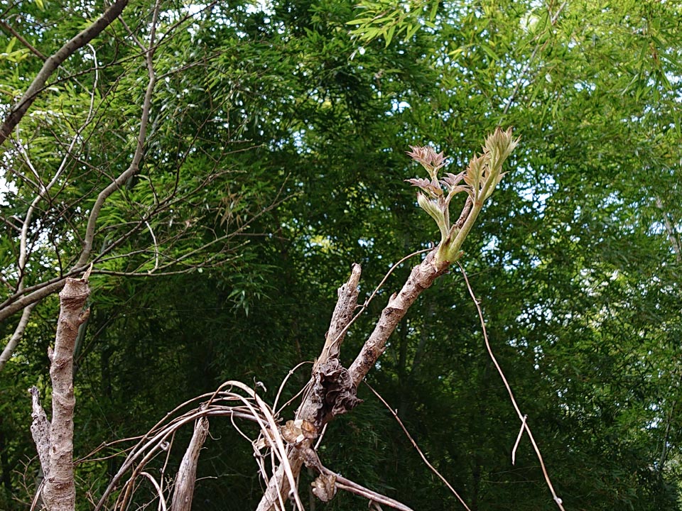 南へ下ったところのタラの芽、今年は出が悪く、枯れた木も増えた様なので、良いのを一本採り、一二年は採らずに温存する事に。