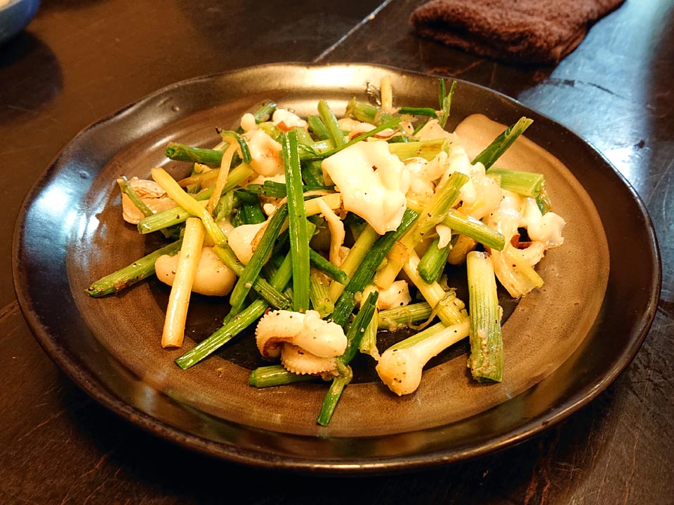 ノビル炒め、豚肉もウマいけど、スミイカのゲソも合うわ~♪
