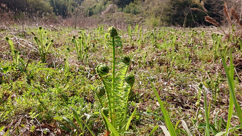 いや~、ここにコゴミが生えだした頃は二株ぐらいしか無くってね、いつか群生する様になったらいいなぁと思ってた。