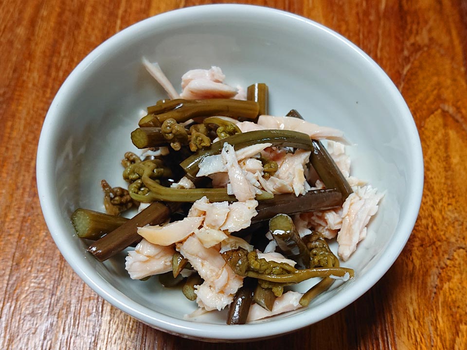 こたな木季節メニューイチ推し、ワラビとサラダチキンの和え物がウマかったのね。