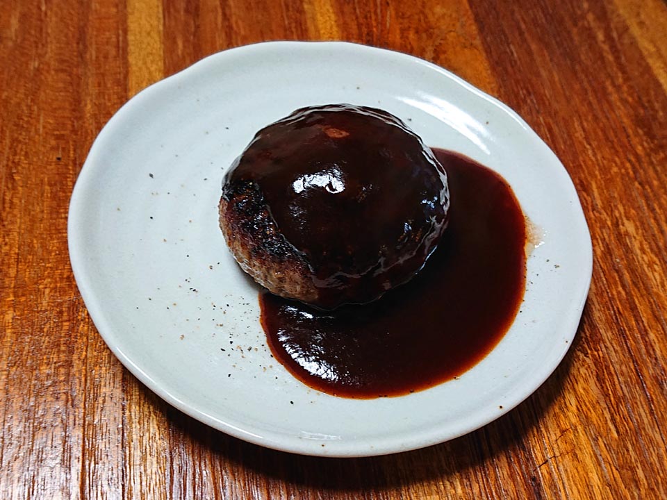 ソースは肉汁が残ったフライパンにバルサミコ酢・オタフクソース・ケチャップ・日本酒を順次投入し、軽く煮たてただけのシンプルお手軽仕様だけど、そん所そこいらのデミソースには負けてない(らしいよ)
