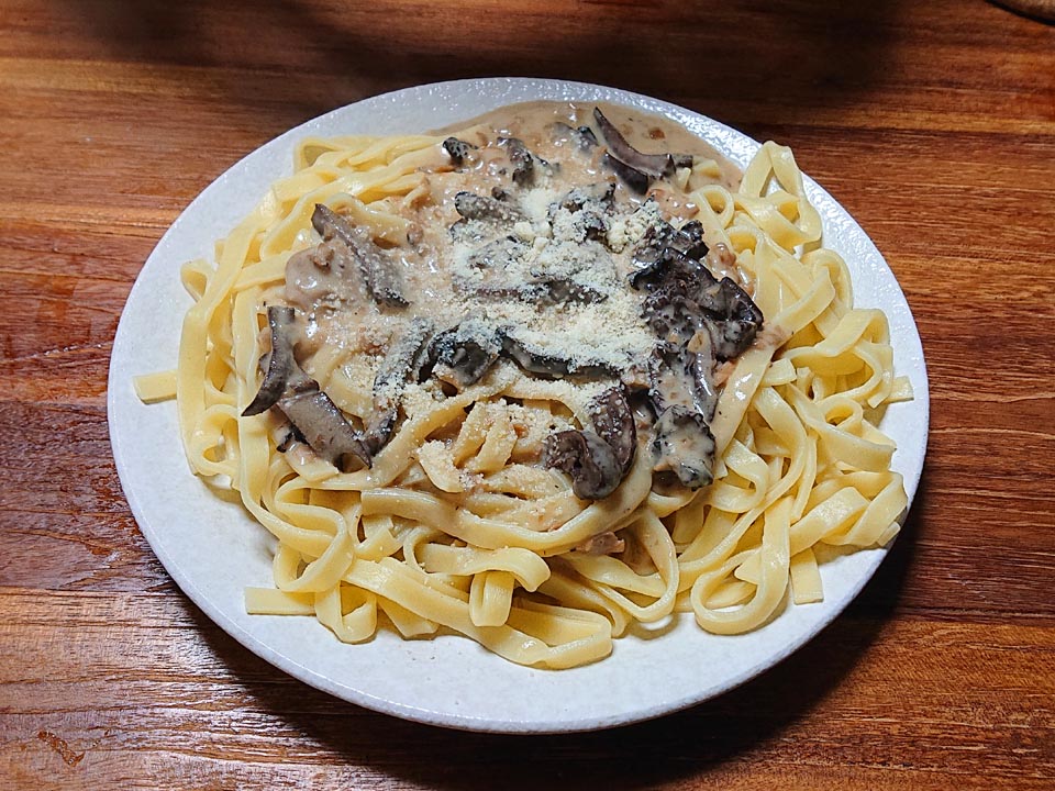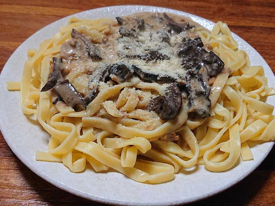 そいつを市販のクリームソースに混ぜ込んで、フィットチーネ・コウタケ・サルサ ディ パンナ。