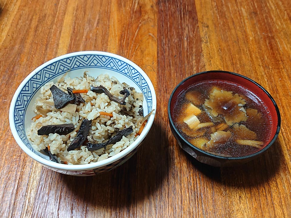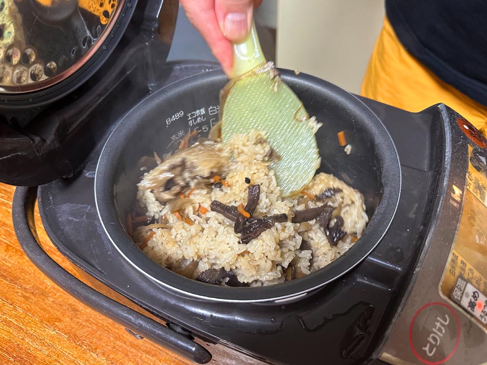こうして具材に汁の味をしみこませたら、きのこのフレーバーが存分に滲出し、濃いめに煮詰まった汁と水を塩梅ェして米を炊く。