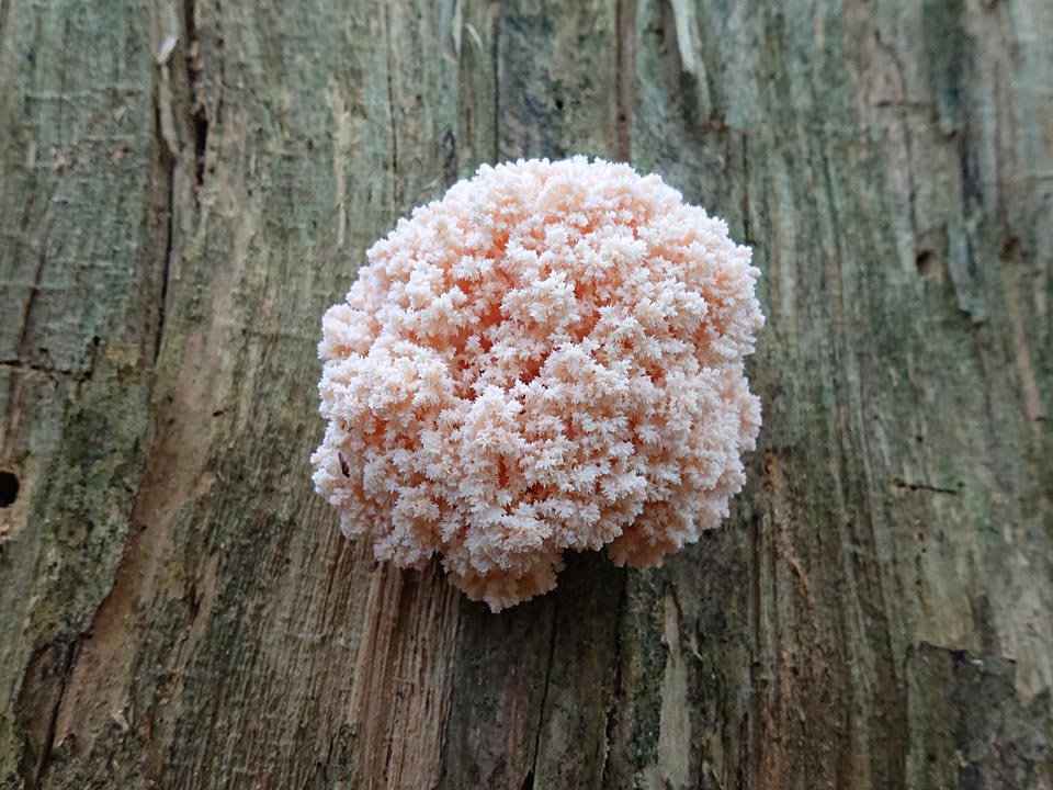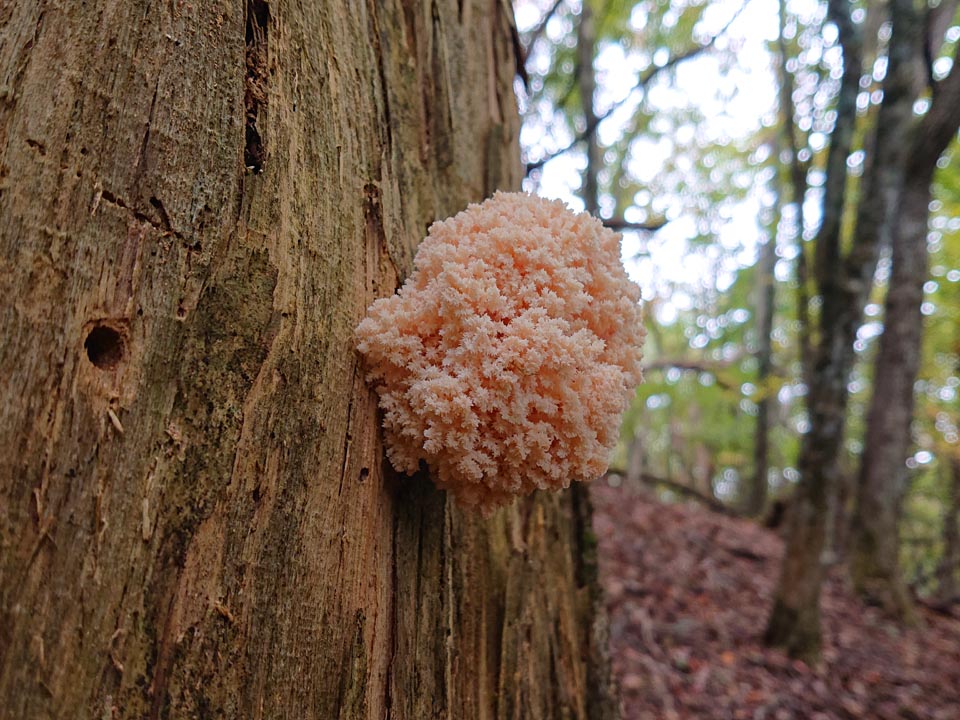 太い立ち枯れに、握り拳大のサンゴハリタケモドキ幼菌。