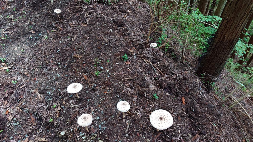 林道を歩いて車へ向かう途中、カラカサタケ群生。