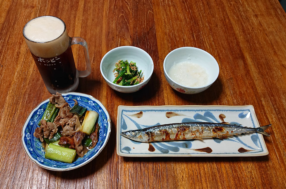 昨夜は焼き秋刀魚と鴨葱炒めで一献。
