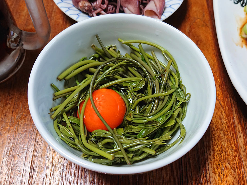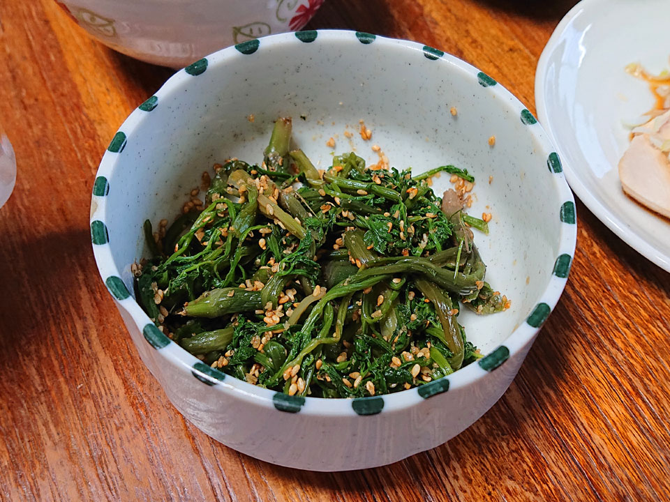 ワラビ・芹・鳥ポン酢差しで宅打ち。