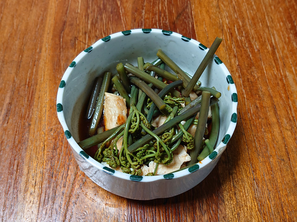 先日山で採って来たワラビでもって、こたな木直伝鶏むね肉と合わせてポン酢。