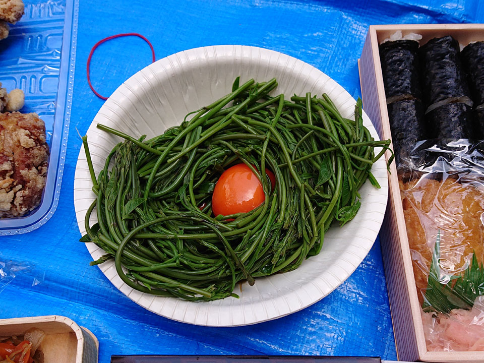 赤ウインナー・玉子焼き・芹胡麻和え・ヤブカンゾウお浸し・ノビル・土筆佃煮・アケビ蕎麦・昔ながらのシウマイ・唐揚げ・ポテサラ・鶏チャーシュー・味吟の海苔巻き&お稲荷さん。