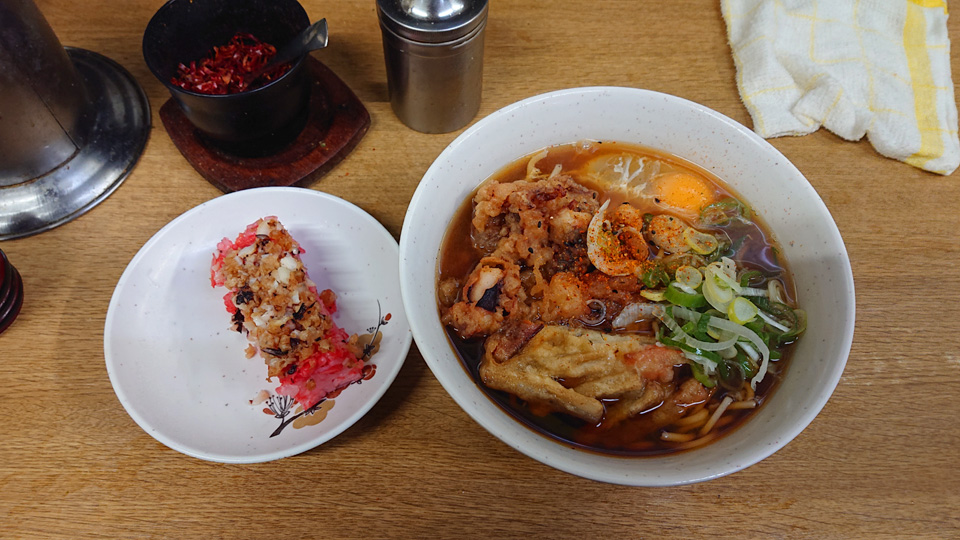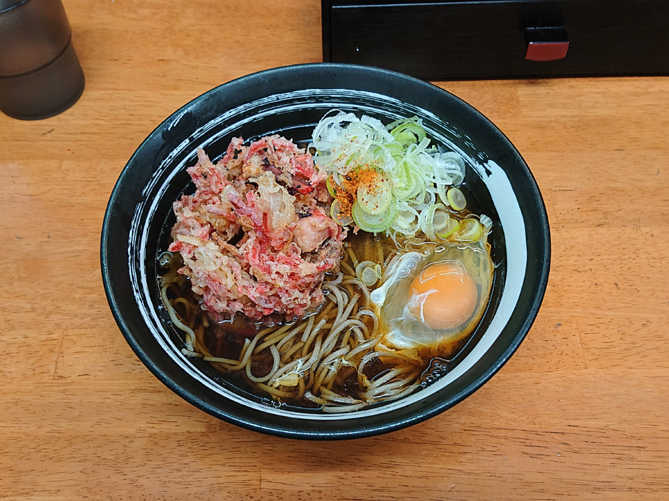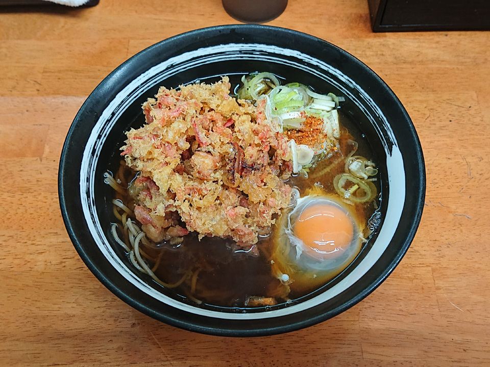 3月8日はつぐみ食堂にて、ゲソ生姜かき揚げそば・生卵。