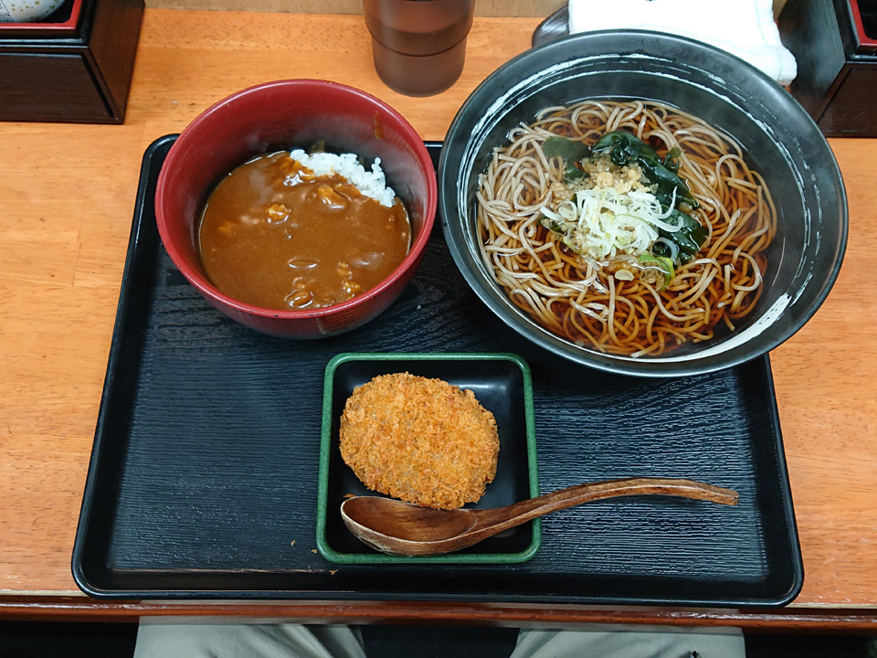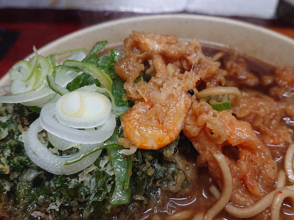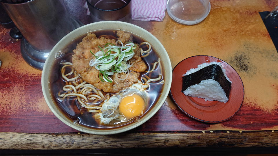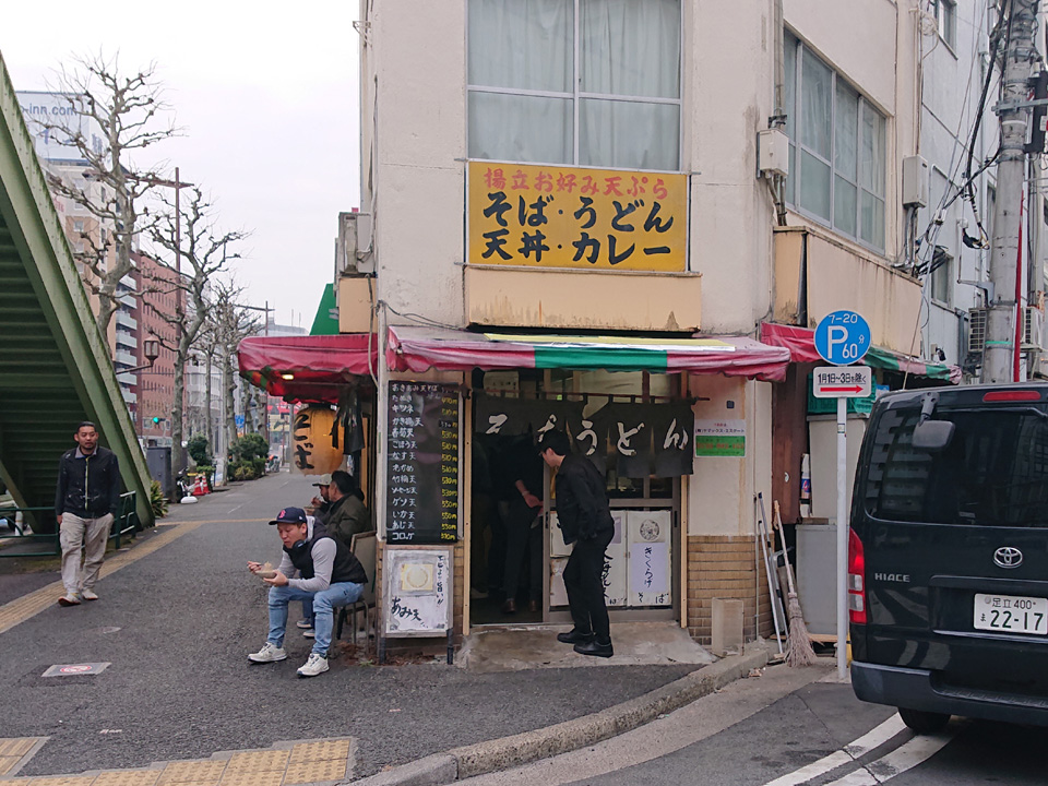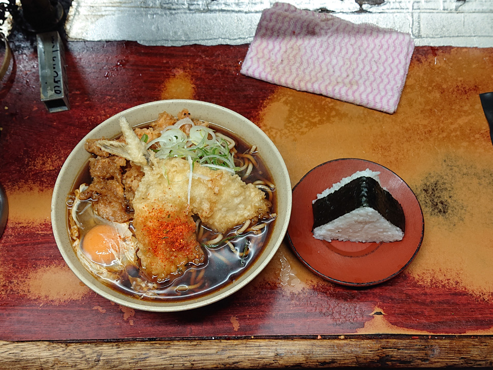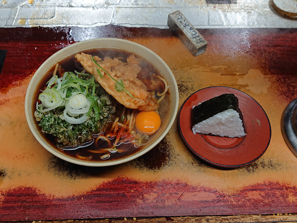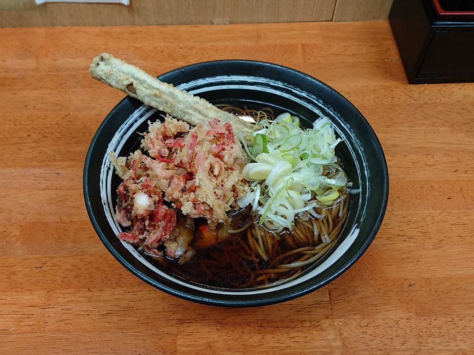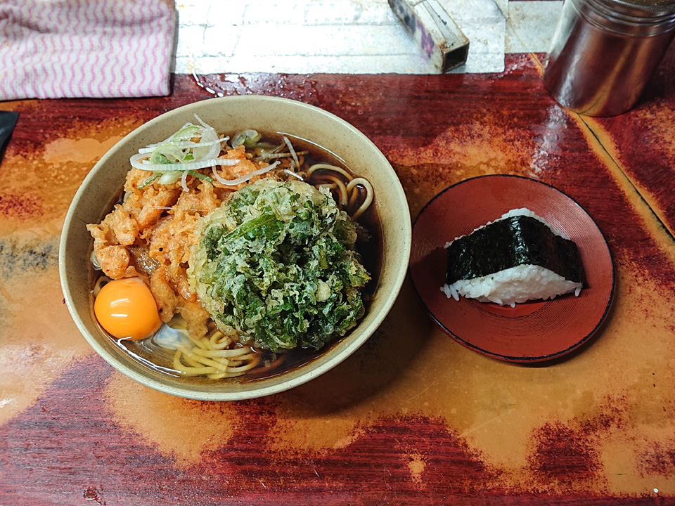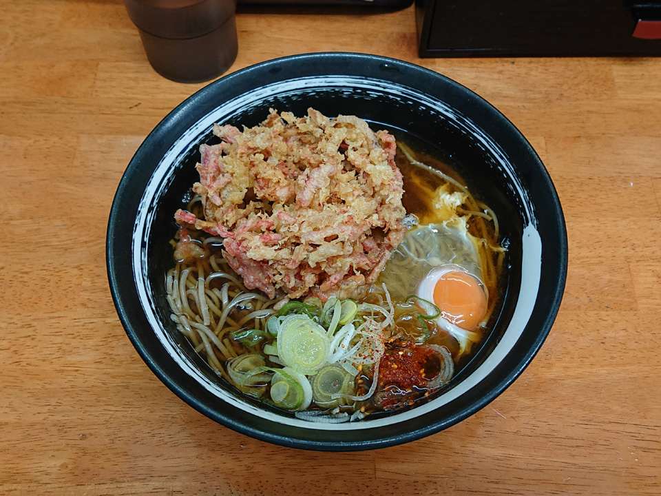 2月23日は東神田そば千であみ天そば・春菊・生卵・おにぎり・つゆ多めでお願いします。