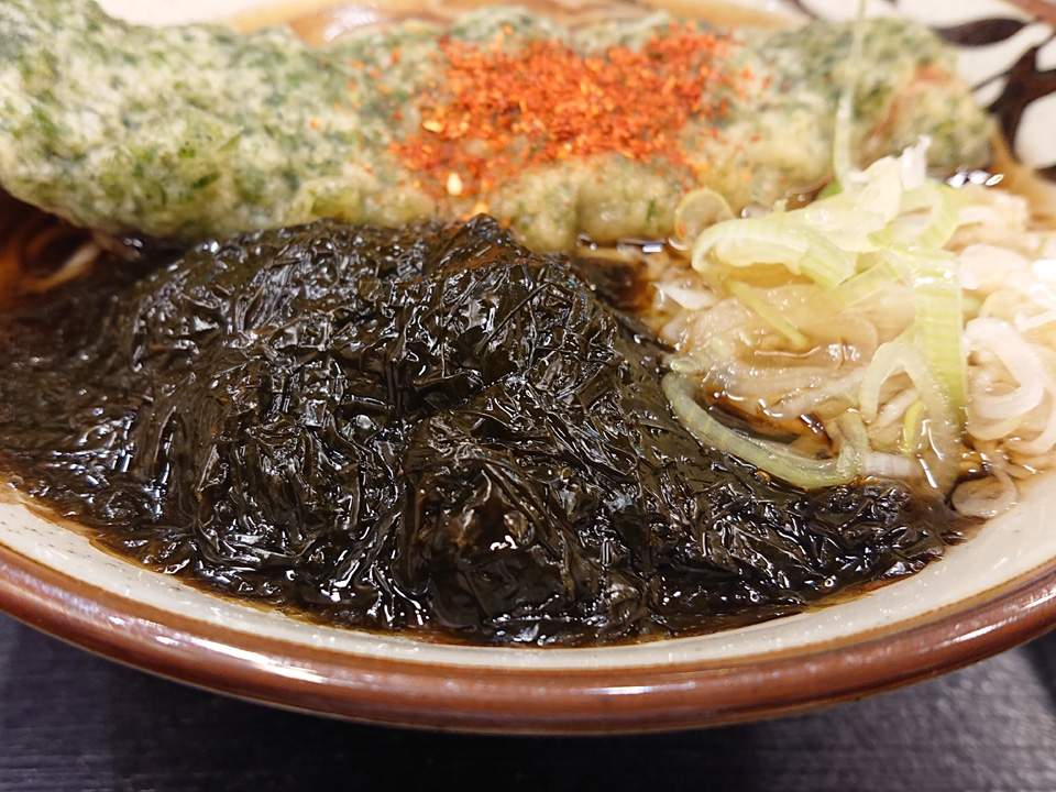 本日は生海苔そばに竹輪天トッピング、半ライス。