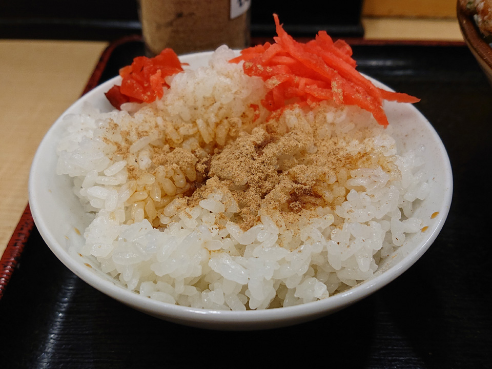 半ライスに付随して来るおかか粉を振りかけて、醤油をちょろっと。